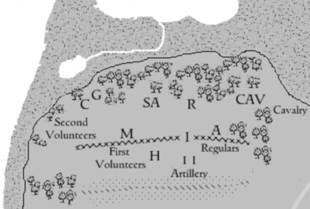 At the far left of this parade line is the Second Regiment�of Volunteers, 330 men under Colonel Sherman.�To their right, at the center of the Texian force, is Colonel�Burleson�s First Volunteers, 386 men strong. Next�are the 32 men of Colonel Hockley�s Artillery Corps.�They man two iron canon, six-pounders called the Twin�Sisters, gifts from the people of Cincinnati. To the right�of the artillery are 92 men of the Regular Army under�Lt. Colonel Millard. At the extreme right is the Cavalry,�62 mounted men commanded by Colonel Mirabeau�Lamar, just yesterday a private. All advance in perfect�silence.